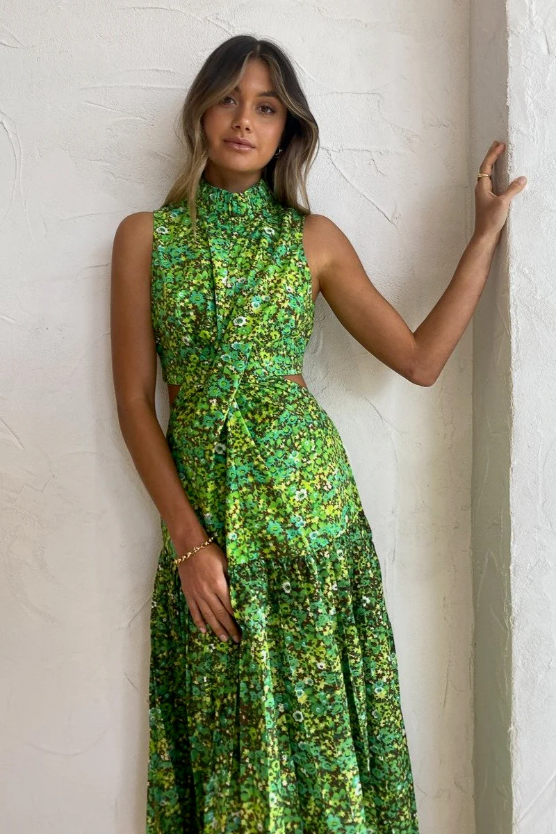 Make a bold entrance in this vibrant acid-green Alemais dress. Showcasing the Phyllis Twist Front Pleat style for a refined touch, its fit-and-flare silhouette perfectly accentuates the figure. Ideal for weddings or cocktail events, this sleeveless design flaunts a lovely floral pattern complemented by artful pleating. Tailored in size AU 8 / US 4, this long midi dress promises to turn heads at any special occasion.