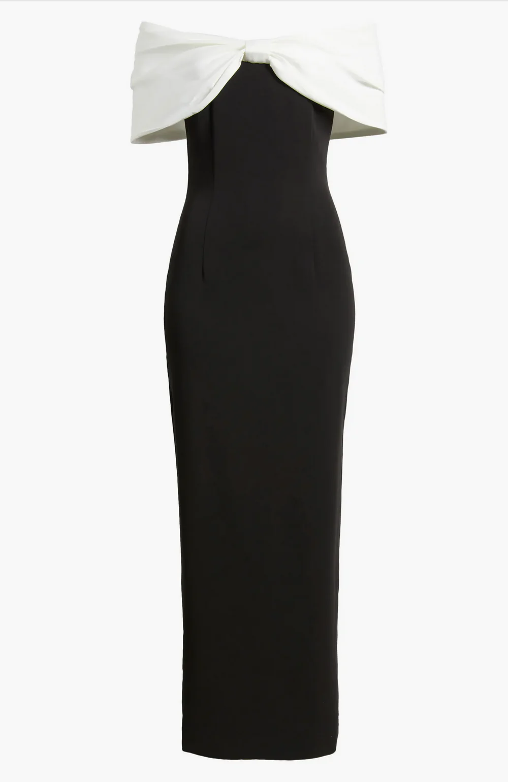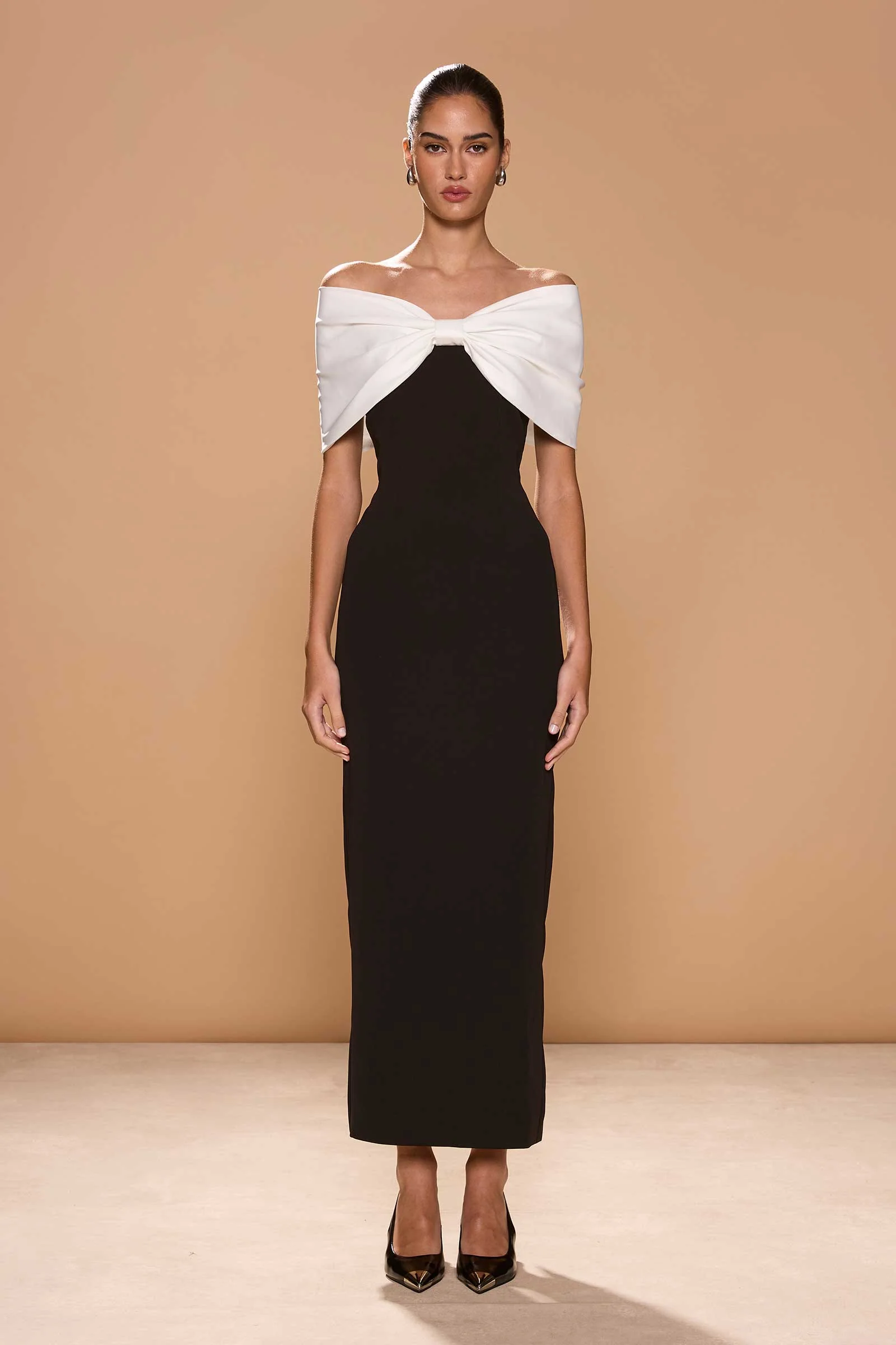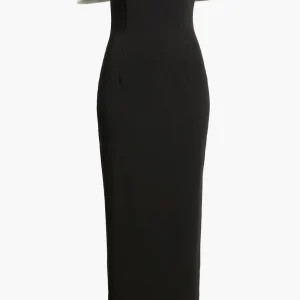 Designed for versatility, the front tacks of the bow can be removed, allowing it to fan out dramatically for a more sculptural, high-fashion effect. The midi-length cut offers timeless elegance, while the strapless design keeps the focus on the striking bow detail.